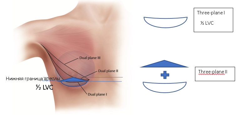 Выделяют 3 типа двухплоскостной техники, в зависимости от уровня пересечения волокон большой грудной мышцы и паренхиматозно-грудного соединения.