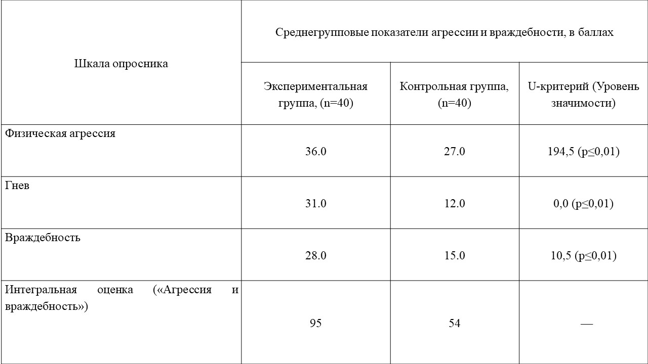 Все полученные значения U меньше критического (U=292 для p≤0,01), следовательно, различия между группой мигрантов и их сверстников по уровню физической агрессии, гнева и враждебности являются статистически значимыми.