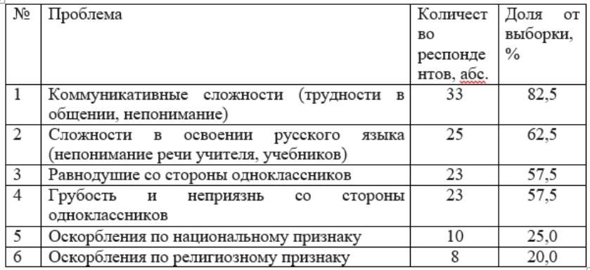 Таблица 4 – Проблемы, с которыми столкнулись подростки-мигранты в школе принимающей стороны (N=40)